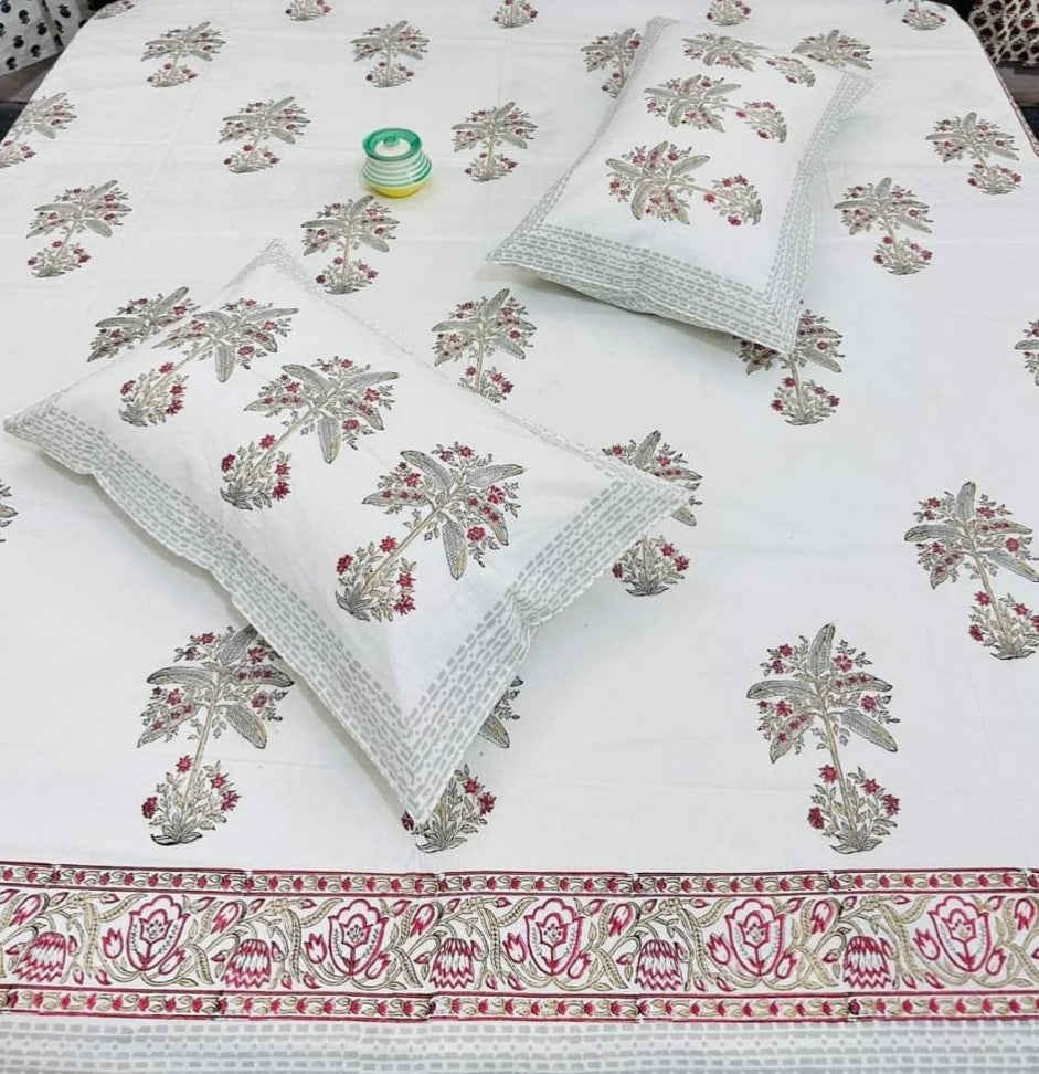 Pure cotton wooden hand block printed premium quality king size double bedsheet with two flapped pillow covers.