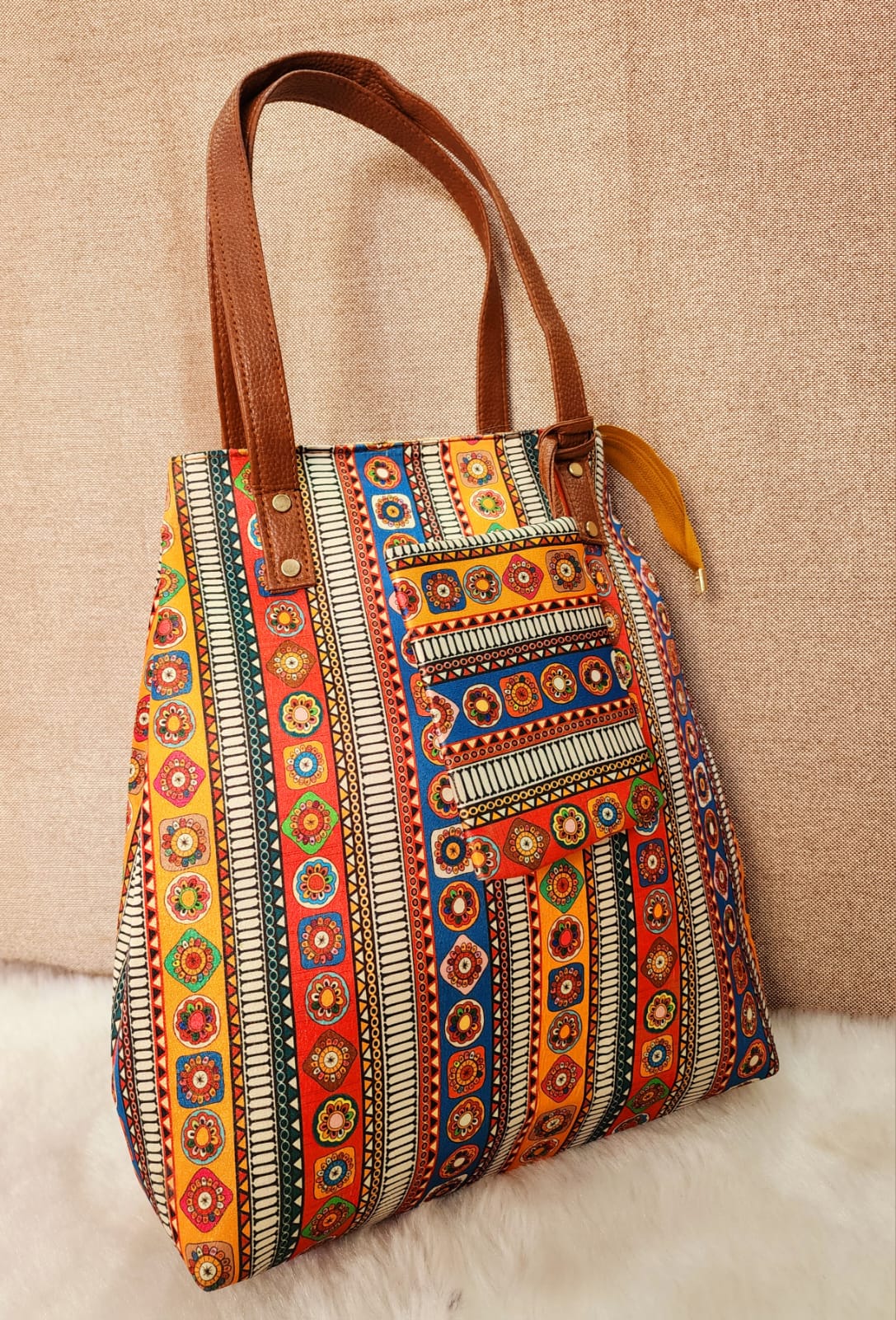 Bright, colourful and super spacious handbag with pouch that is apt for any occasion or place. Has a small money pouch.