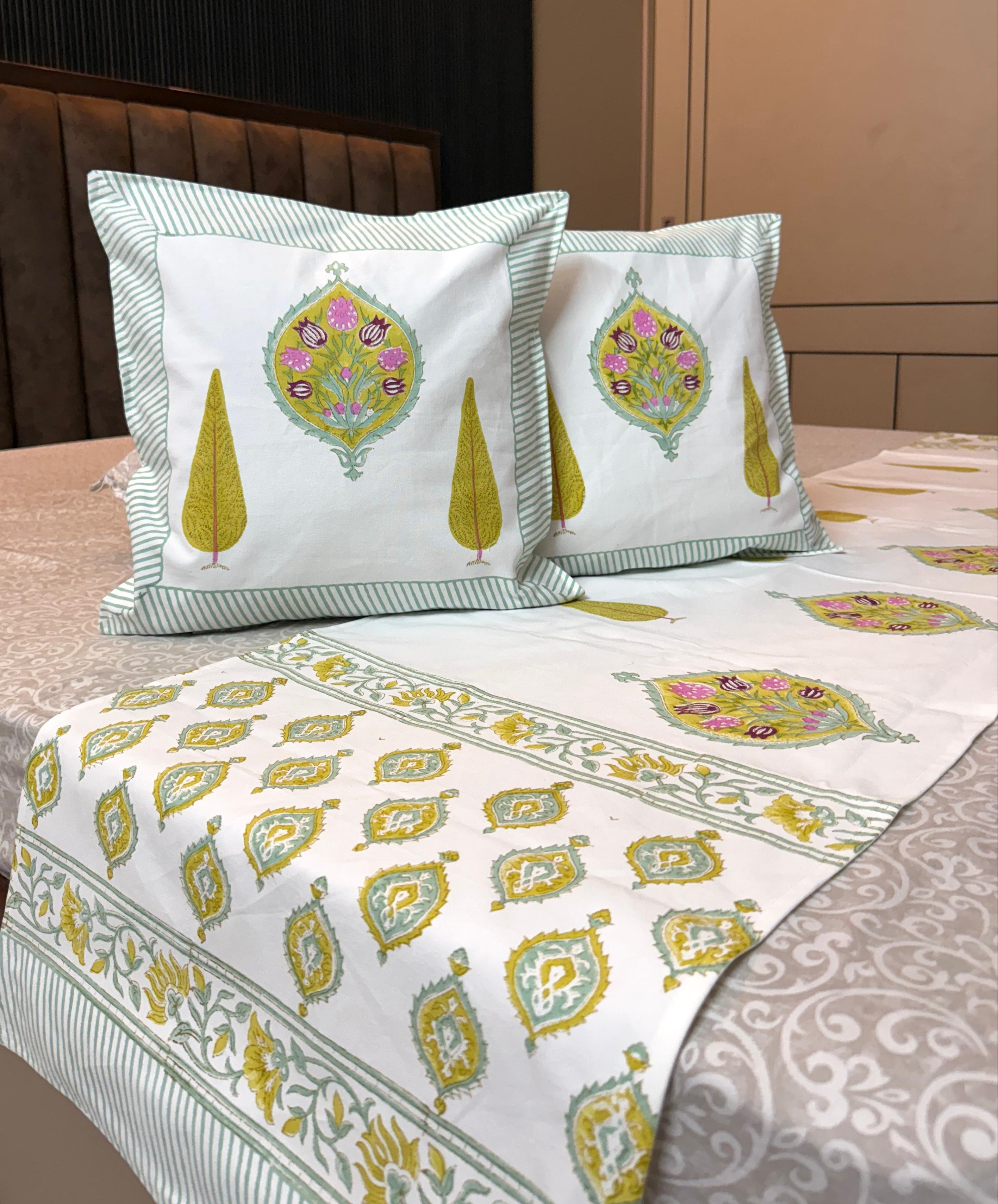 Pure cotton hand block printed bed runners with 2 cushion covers