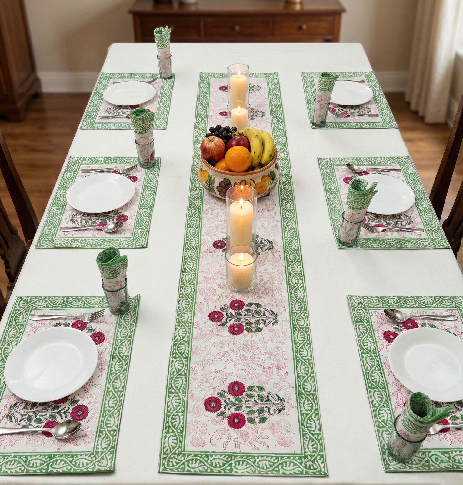 Pure cotton hand block printed placemats, runner and napkin combo for 6 seater dining table