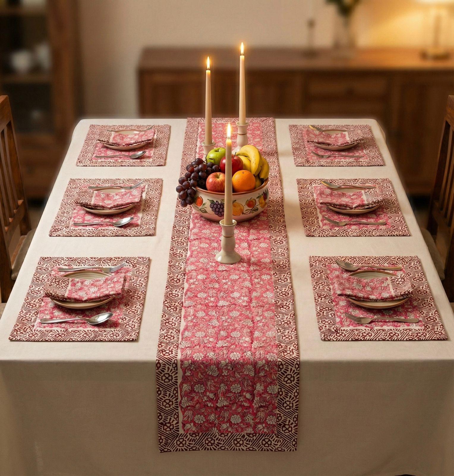 Pure cotton hand block printed placemats, runner and napkin combo for 6 seater dining table