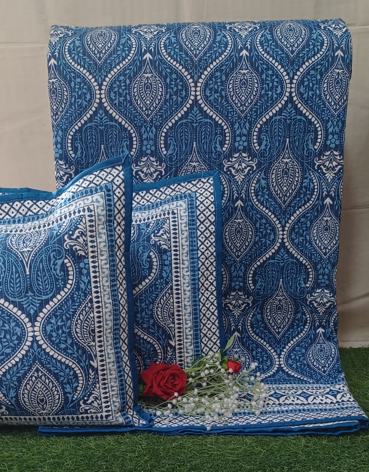 Add a burst of these vibrant colors and floral prints to your home decor with our pure cotton daily use quilted double bedcovers with two quilted pillow covers.