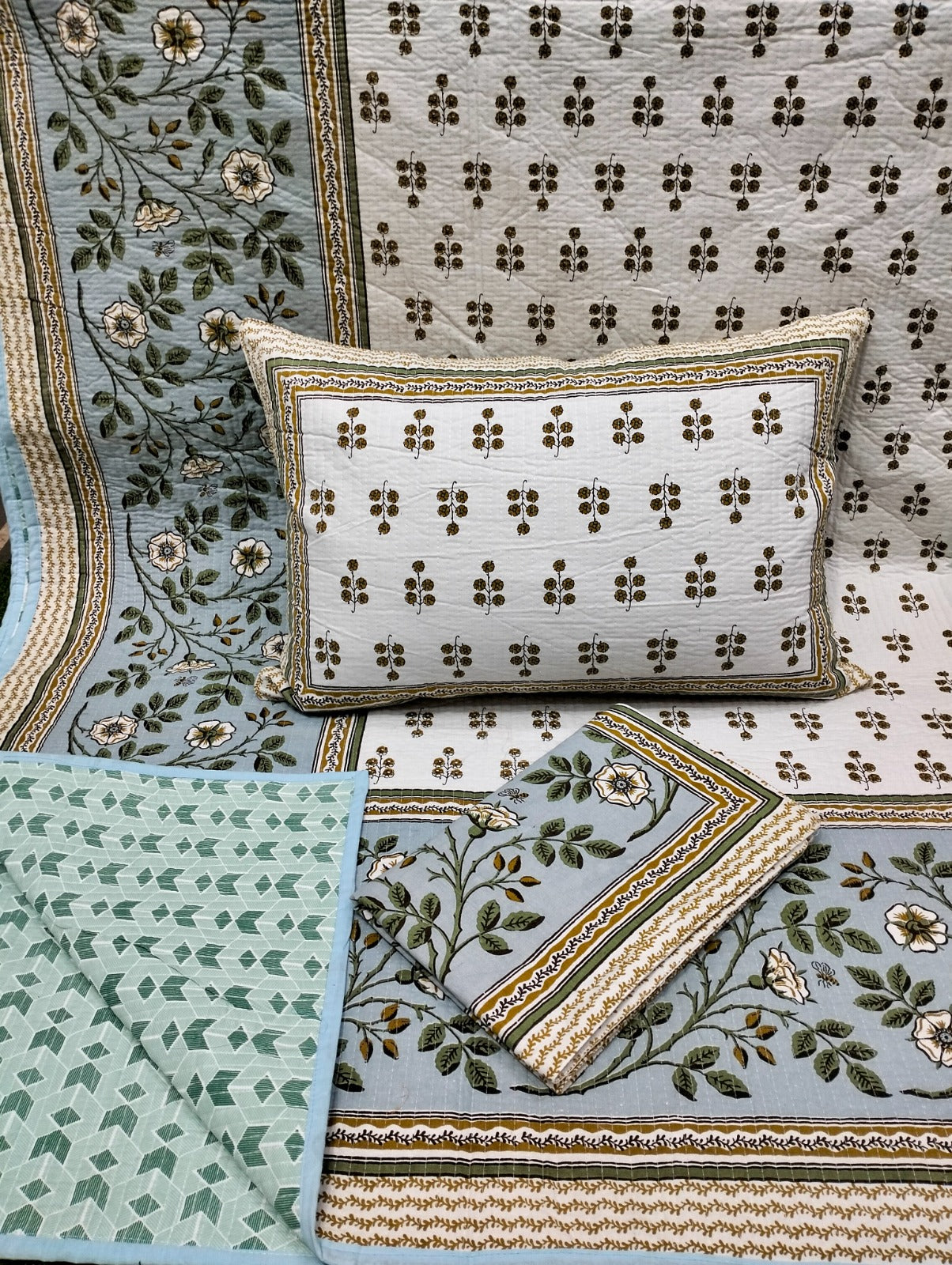 Add a burst of these vibrant colors and floral prints to your home decor with our pure cotton daily use quilted double bedcovers with two quilted pillow covers.