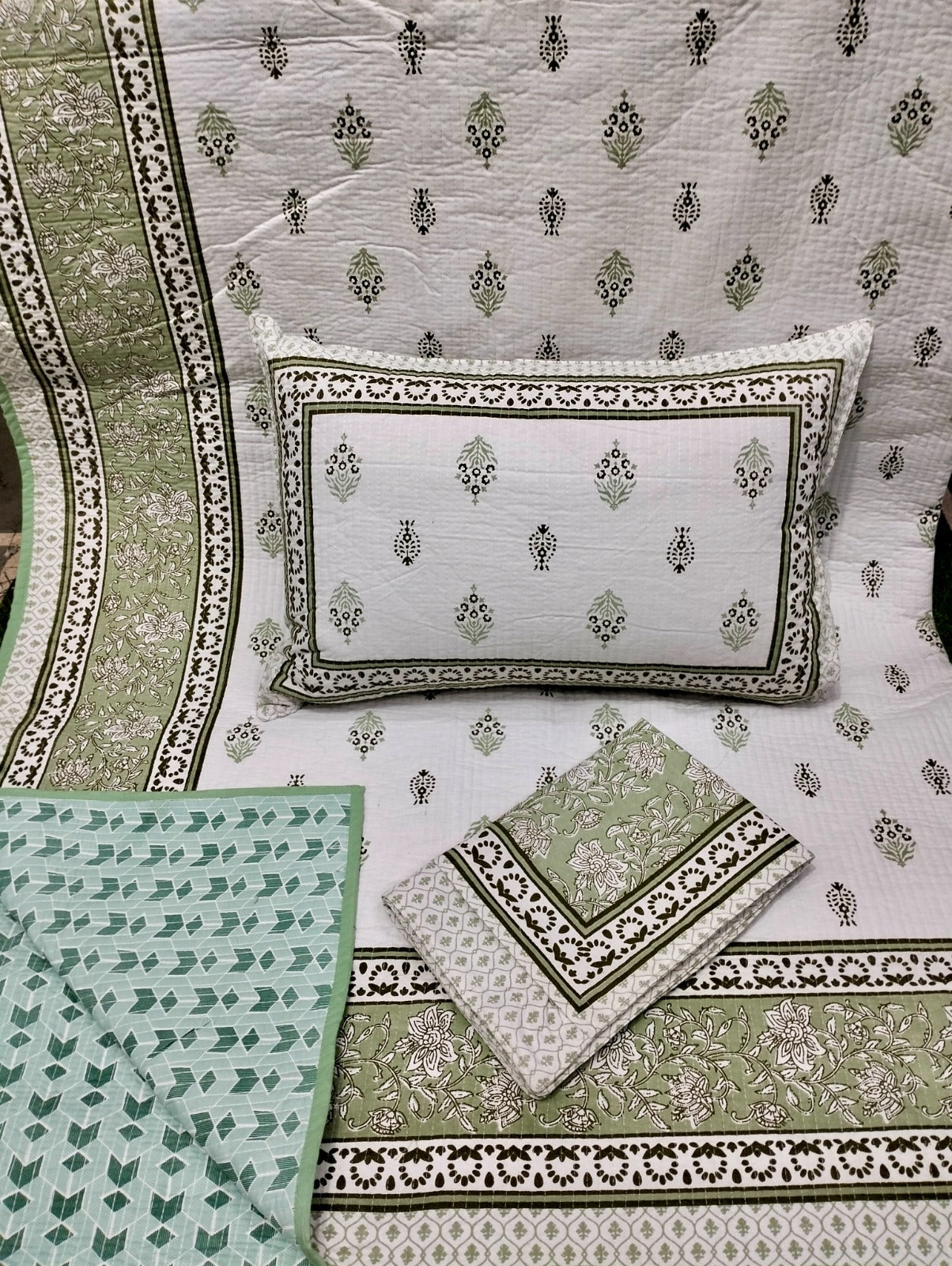 Add a burst of these vibrant colors and floral prints to your home decor with our pure cotton daily use quilted double bedcovers with two quilted pillow covers.