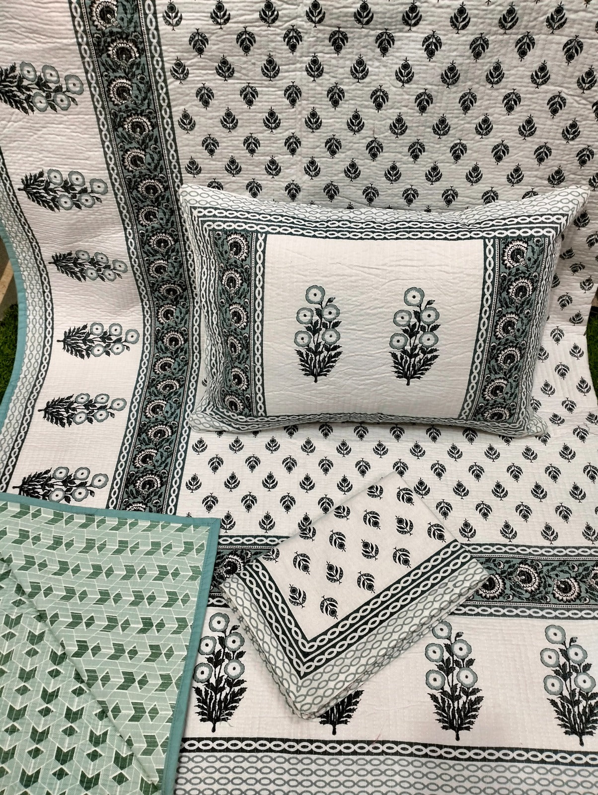 Add a burst of these vibrant colors and floral prints to your home decor with our pure cotton daily use quilted double bedcovers with two quilted pillow covers.
