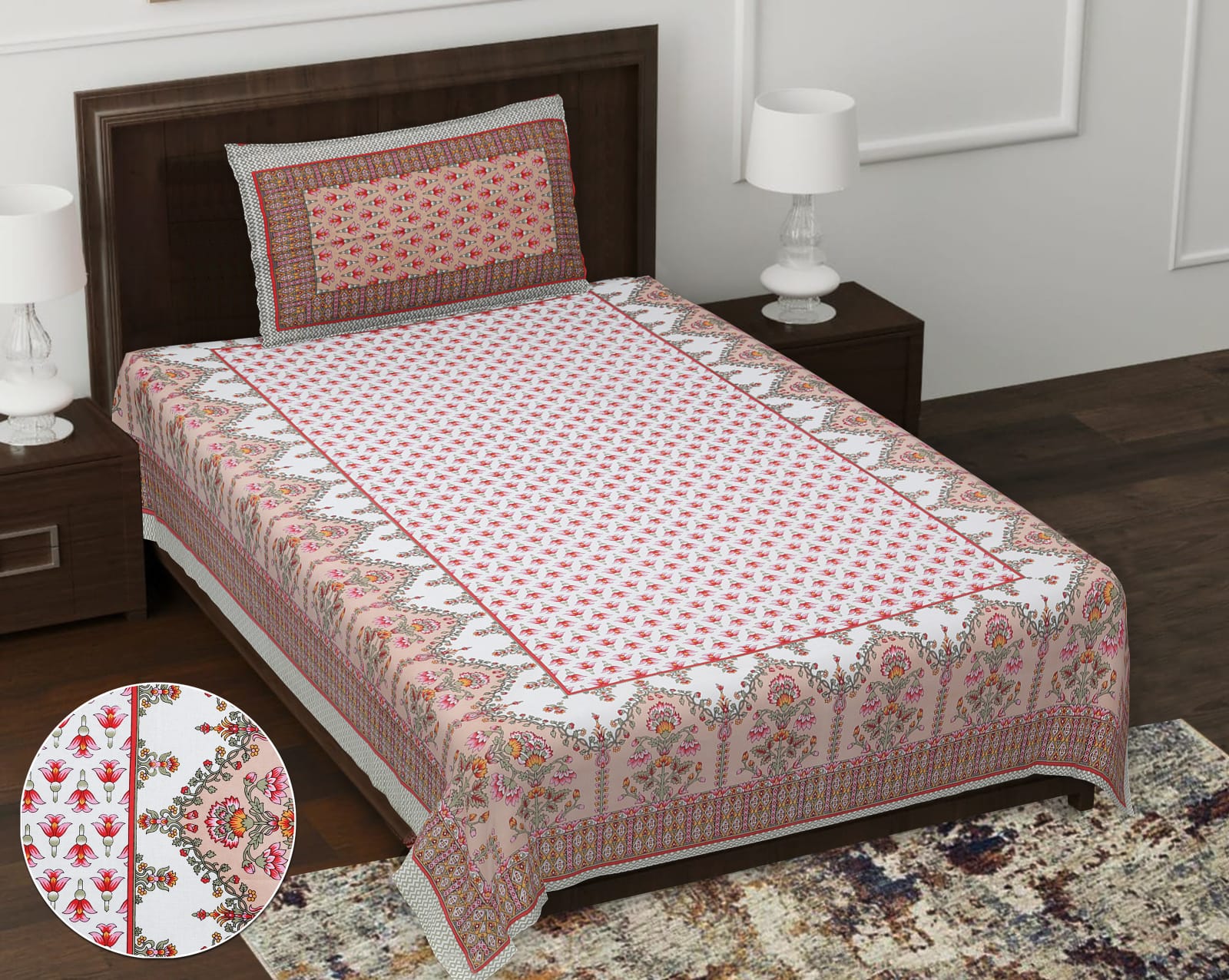 Pure cotton printed bedsheet with one pillow cover for sinle bed.