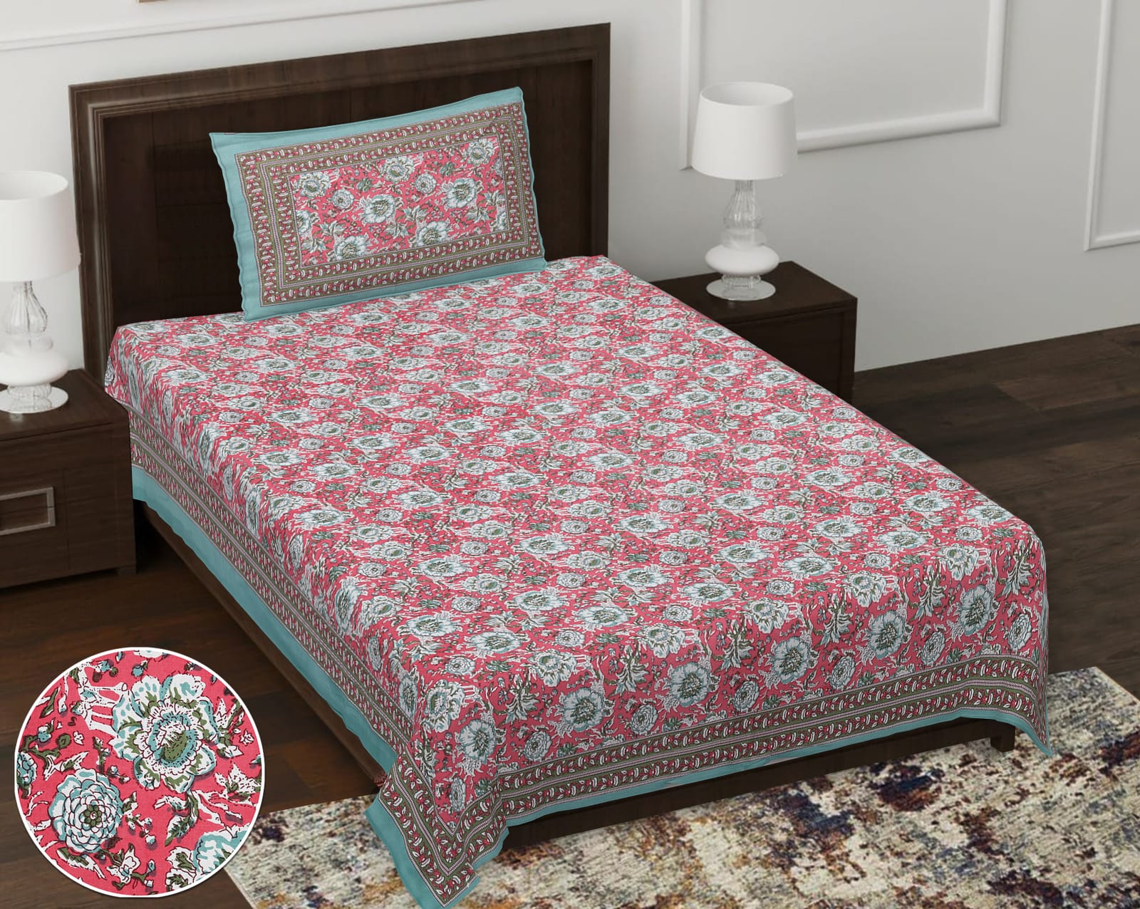 Pure cotton printed bedsheet with one pillow cover for sinle bed.