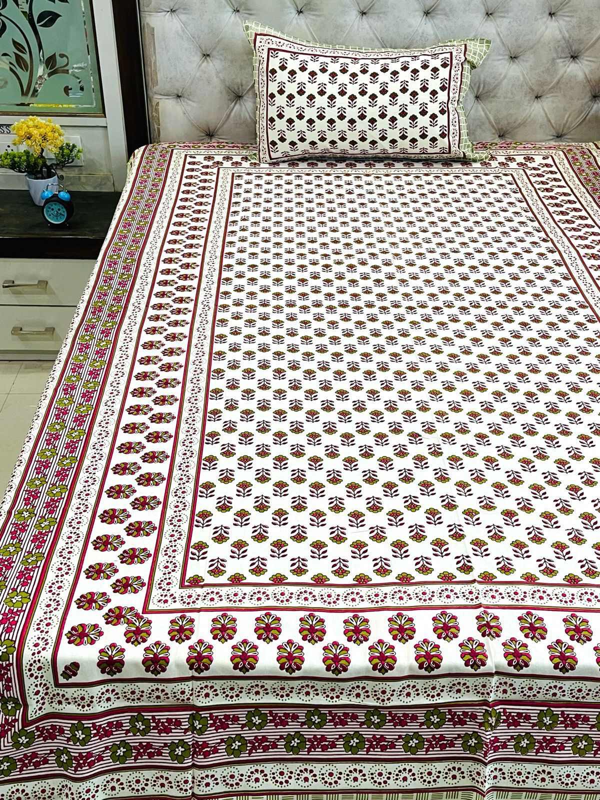 Pure cotton printed bedsheet with one pillow cover for sinle bed.