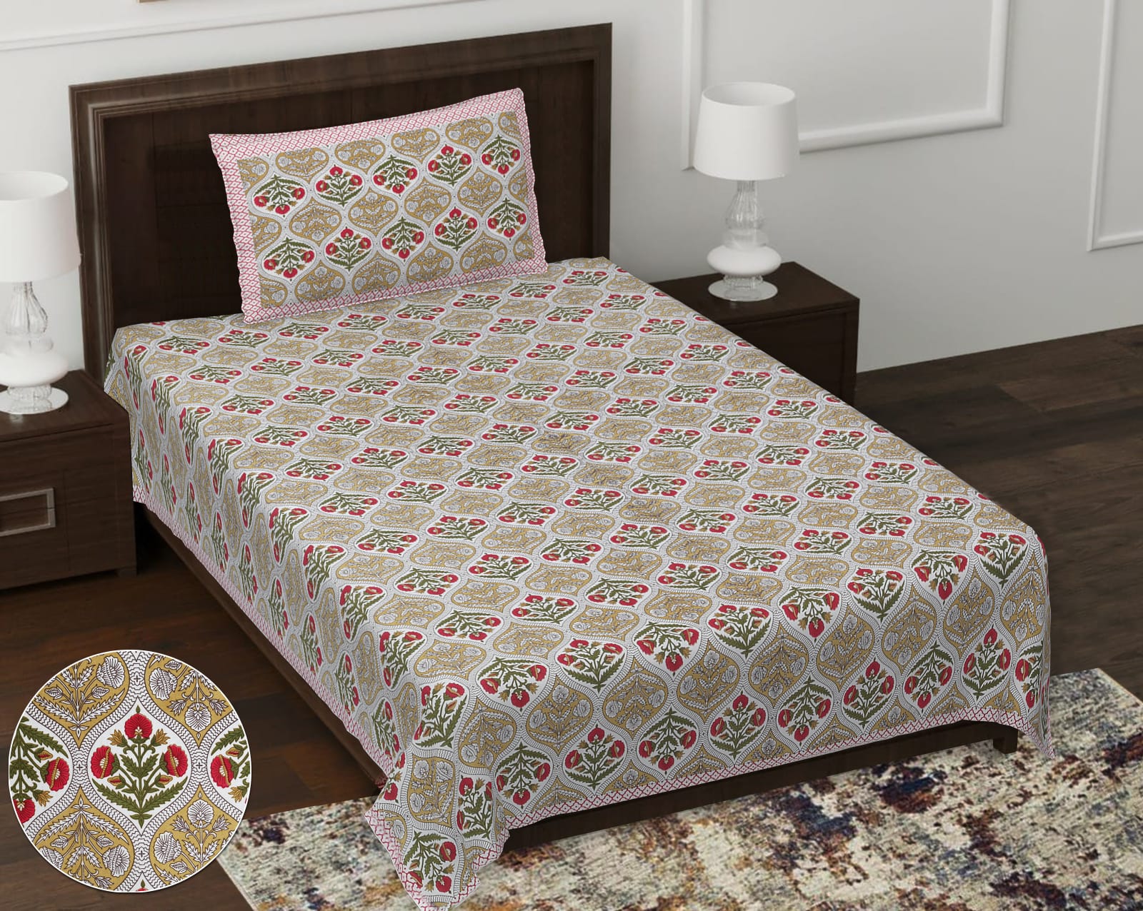 Pure cotton printed bedsheet with one pillow cover for sinle bed.