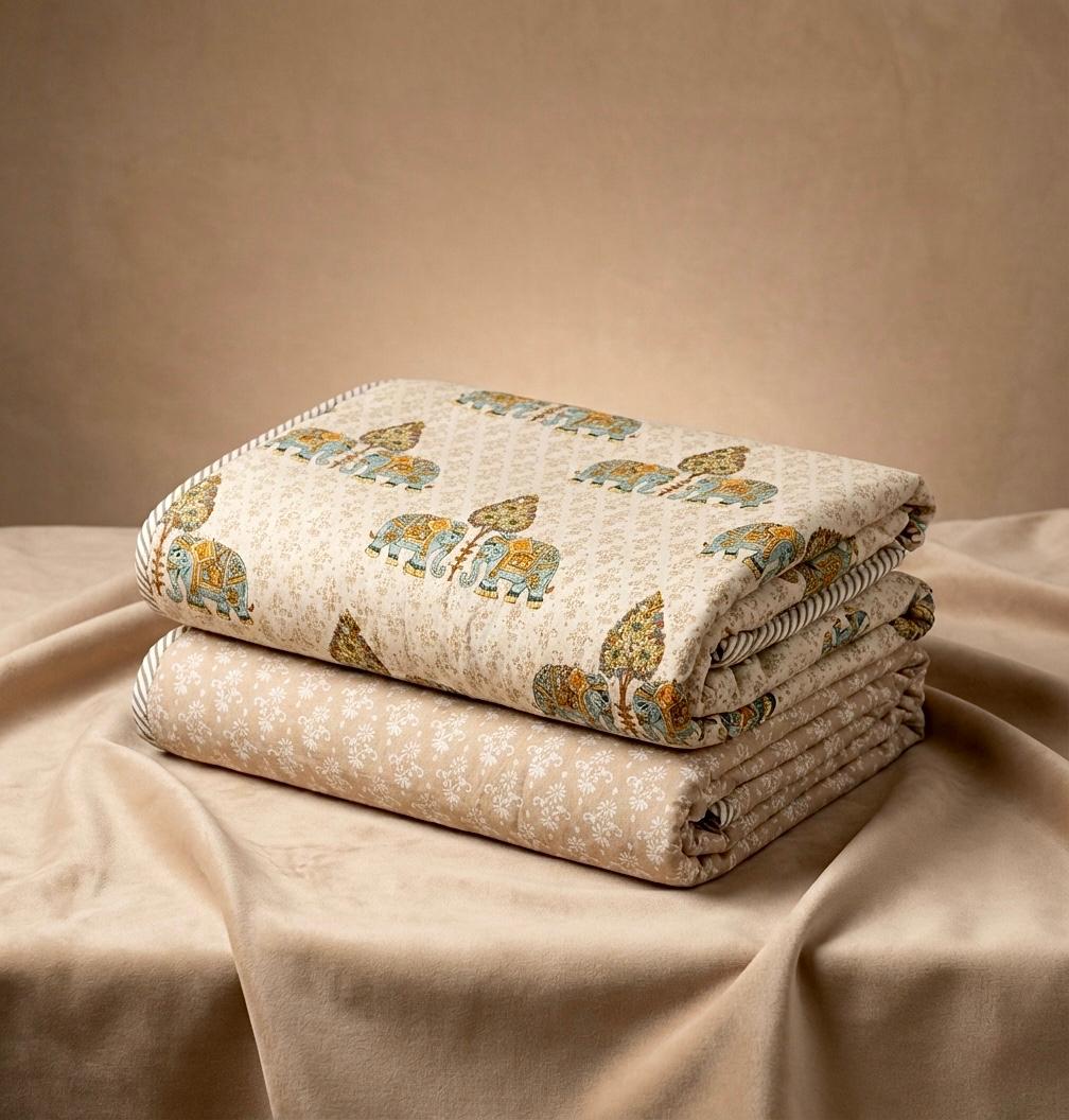 Wrap yourself in comfort with this set of two pure cotton single reversible dohars, each measuring 60x90 inches. Crafted from breathable cotton, these lightweight blankets are perfect for warm weathers. Ideal for layering on beds, sofas, or as versatile throws, they offer softness and durability.