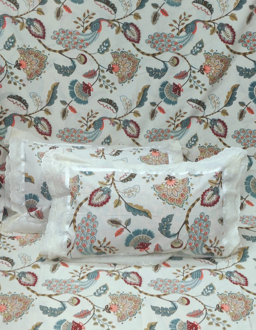 Pure cotton super king size bedsheets with 2 laced pillow covers (108x108 inches/9x9 feet)