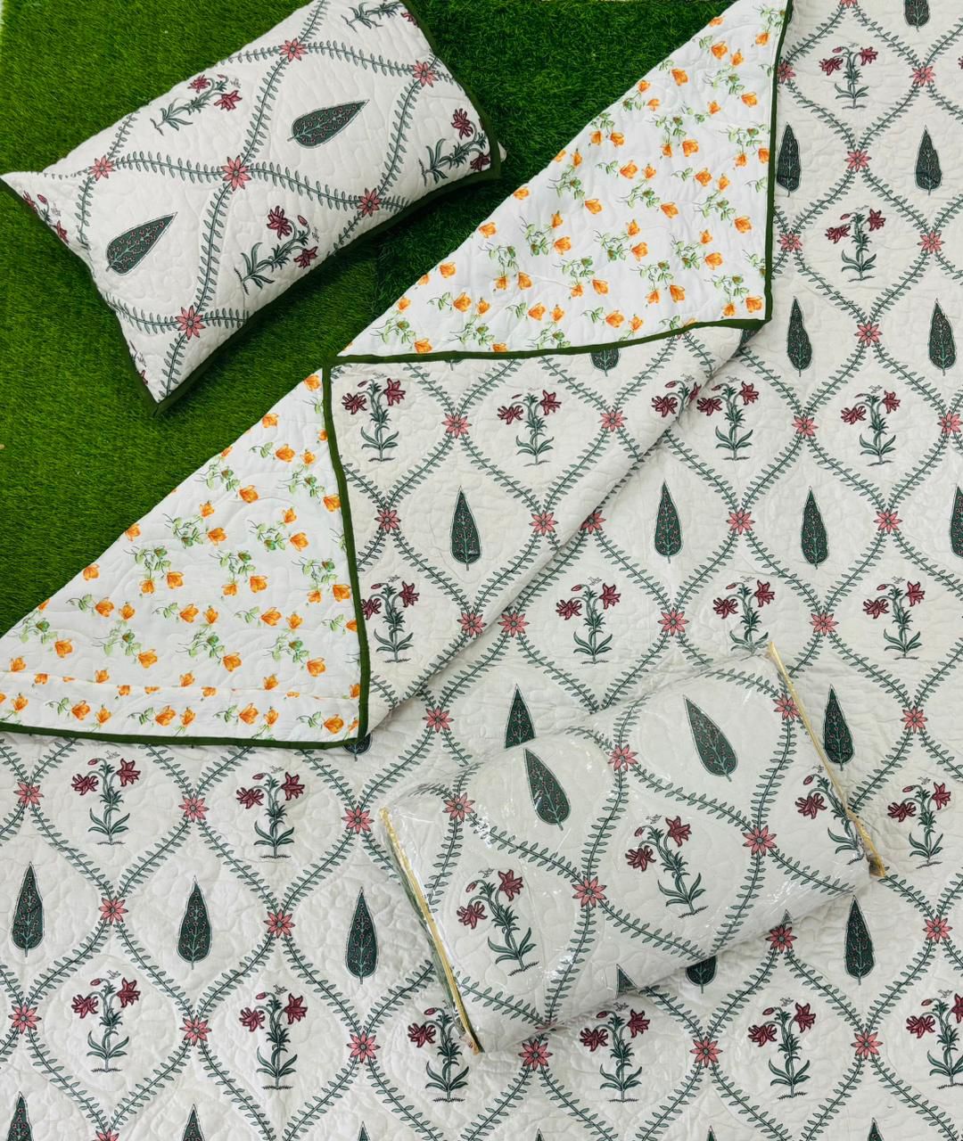 Expertly crafted from pure mulmul cotton, our paani jaal quilted double bedcovers come with 2 quilted pillow covers for a luxurious experience. These hand-block printed, reversible, soft and breathable.