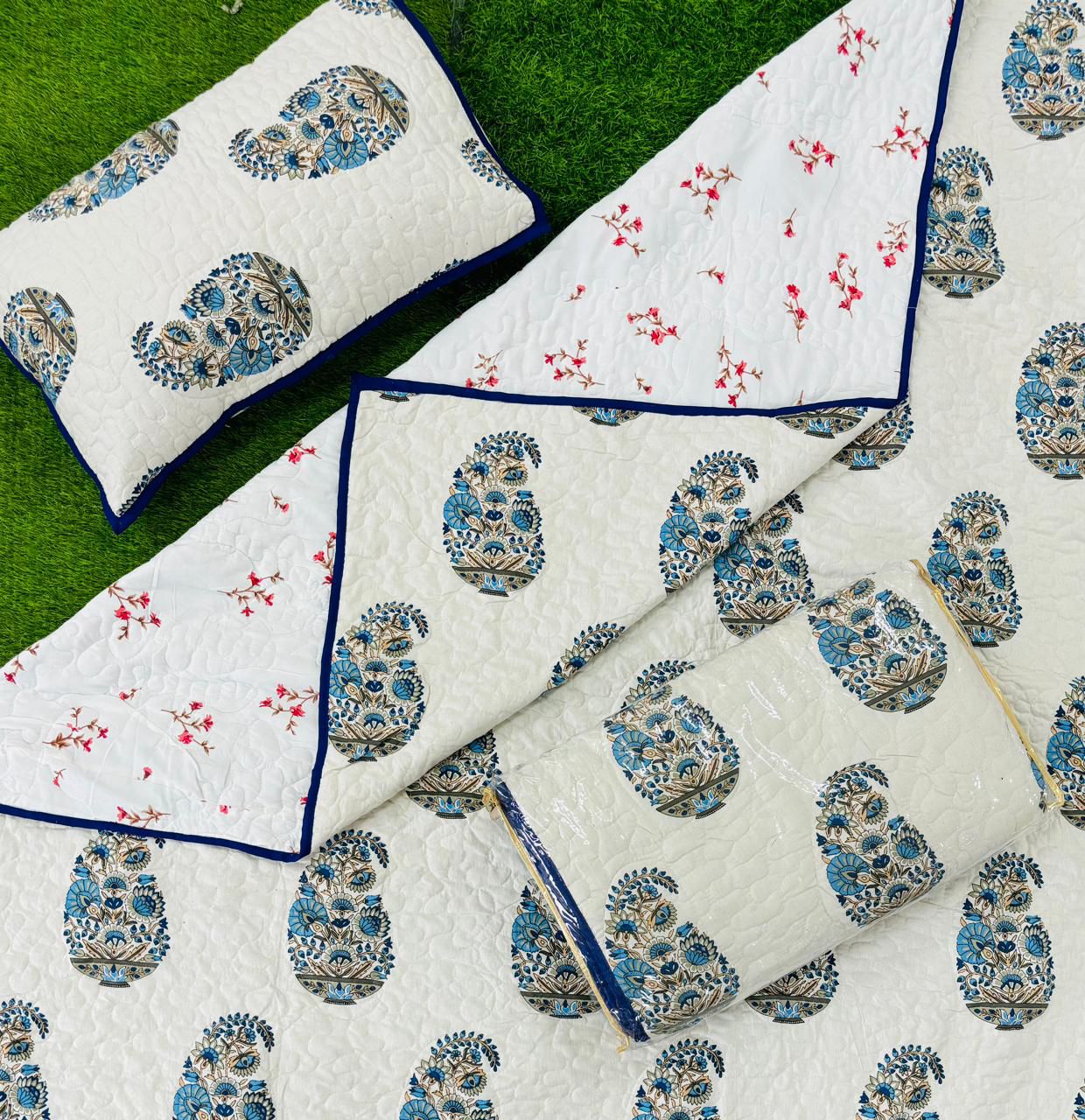 • Pure mulmul cotton paani jaal quilted reversible double bedcovers with 2 quilted pillow covers (90x108 inches)