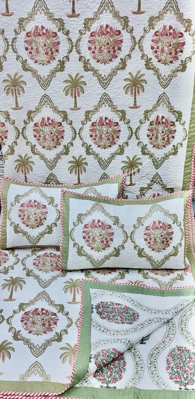 Expertly crafted from pure mulmul cotton, our paani jaal quilted double bedcovers come with 2 quilted pillow covers for a luxurious experience. These hand-block printed, reversible, soft and breathable.