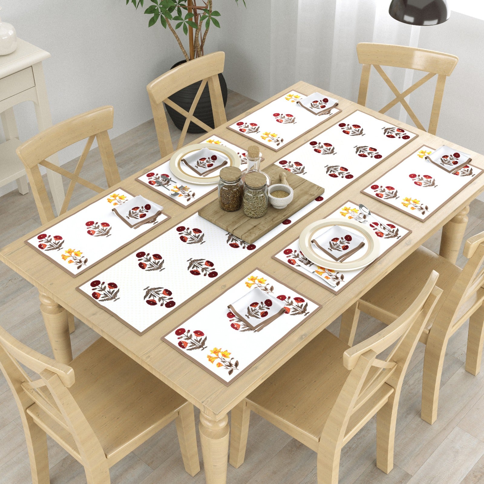 Enhance your dining experience with this 13-piece combo featuring screen printed pure cotton table mats, a runner, and napkins. Crafted from breathable, durable cotton, these pieces offer longevity and are ideal for everyday use or special occasions.