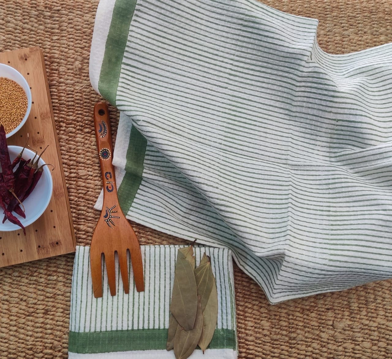 Pure waffled cotton block printed, highly absorbent, easily washable kitchen hand towels available in a set a 3