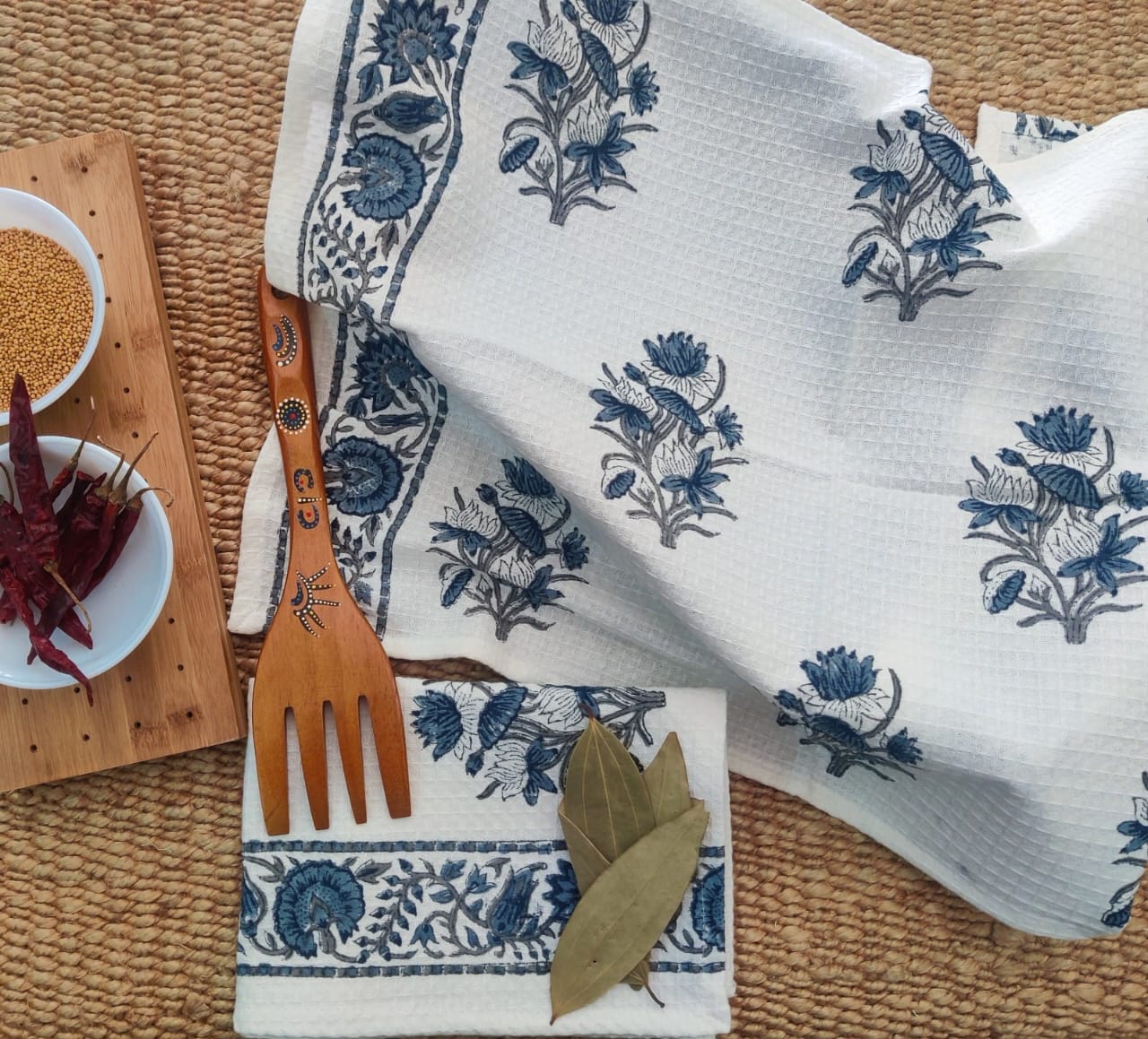 Pure waffled cotton block printed, highly absorbent, easily washable kitchen hand towels available in a set a 3
