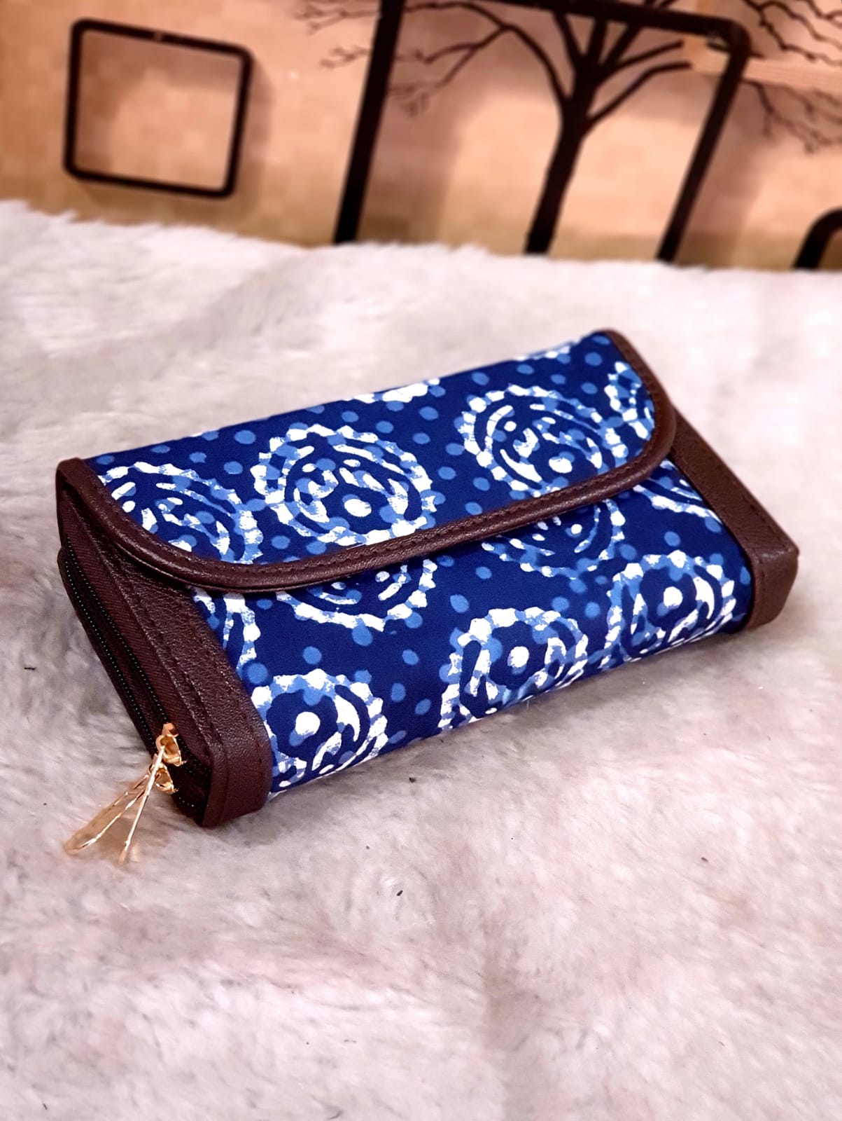 Cotton based hand block printed fabric women’s wallet, compact and yet spacious with double zip compartment to hold up to two mobile phones, multiple cards and cash.