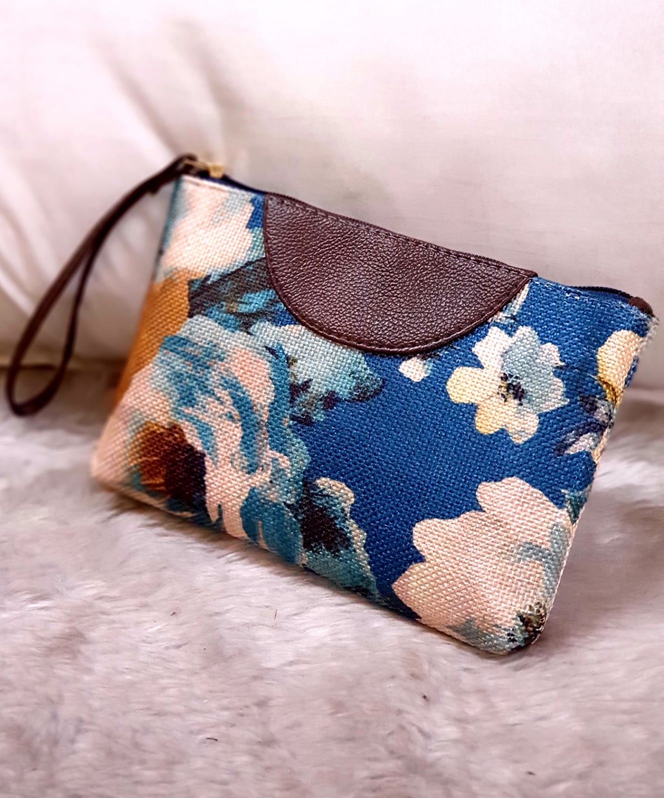 Trendy printed fabric wristlet for women with one wristlet vegan leather strap.