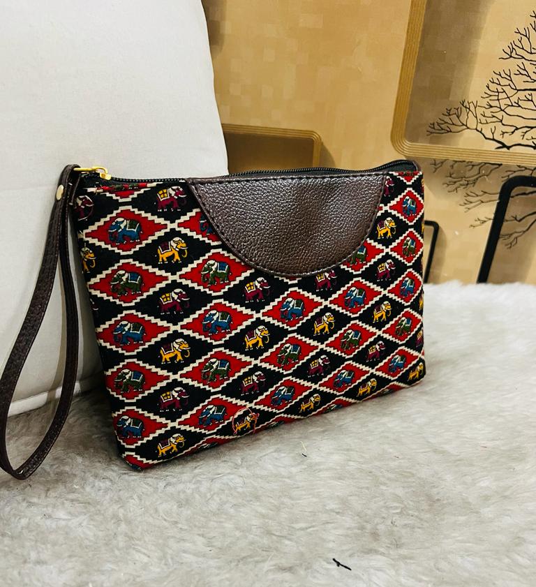 Trendy printed fabric wristlet for women with one wristlet vegan leather strap.