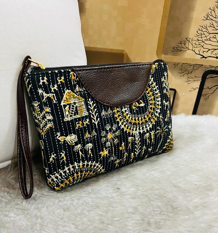 Trendy printed fabric wristlet for women with one wristlet vegan leather strap.