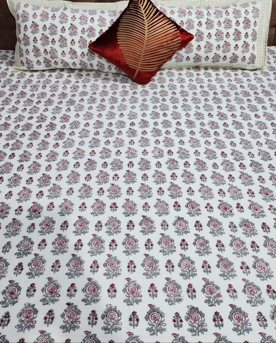 Pure cotton wooden hand block printed premium quality king size double bedsheet with two flapped pillow covers.